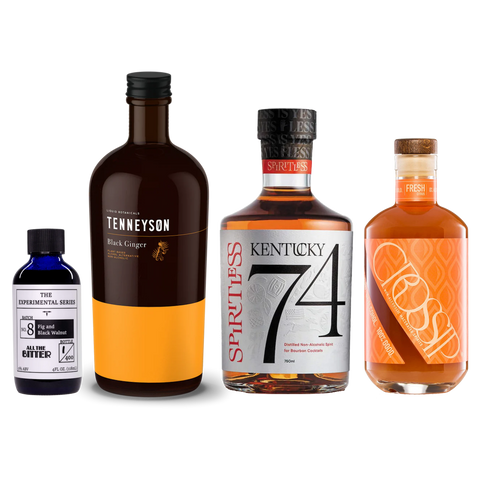 It starts with 1.5 oz of Tenneyson for a deep, aromatic base and 1.5 oz of Kentucky 74 Bourbon alternative, adding a warm, whiskey-inspired depth. 3/4 oz of Citrus Crossip introduces a vibrant, zesty twist that harmonizes with the drink's deeper tones, while two dashes of Fig & Black Walnut Bitters lend a subtle, nutty sweetness and a hint of fig richness.