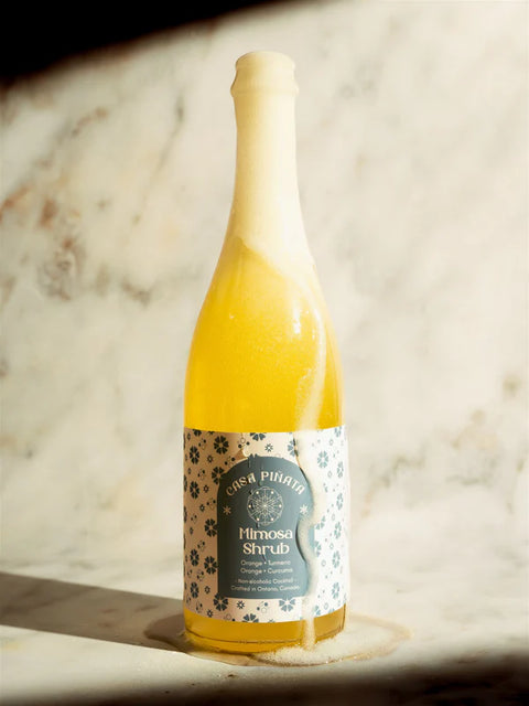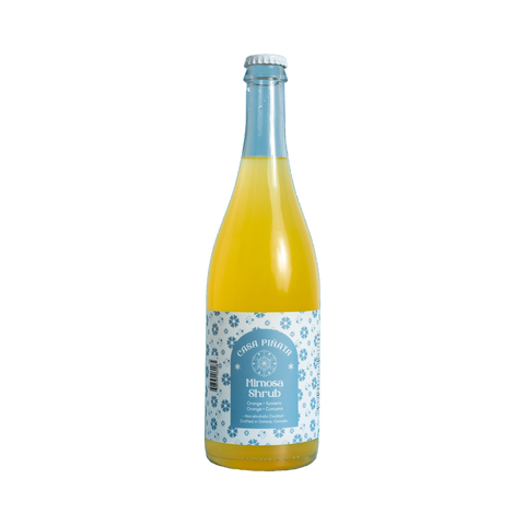 An alcohol free Mimosa made with Valencia Oranges and Niagara Riesling Wine Vinegar. A light and bubbly shrub with a pop of cardamom that pairs perfectly with Sunday brunch. ¡Salud!