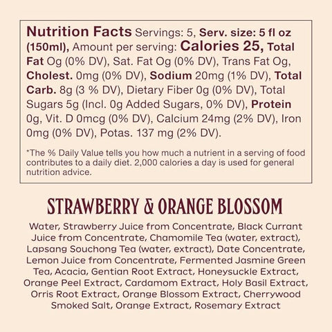 Water, Strawberry Juice from Concentrate, Black Currant Juice from Concentrate, Chamomile Tea, Lapsang Souchong Tea, Date Concentrate, Lemon Juice from Concentrate, Fermented Jasmine Green Tea, Acacia, Gentian Root Extract, Honeysuckle Extract, Orange Peel Extract, Cardamom Extract, Holy Basil Extract, Orris Root Extract, Orange Blossom Extract, Cherrywood Smoked Salt, Orange Extract, Rosemary Extract.