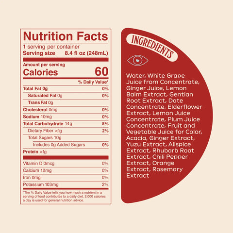 Water, riesling white grape juice concentrate, yuzu juice, lemon balm extract, elderflower extract, gentian root extract, ginger juice, fig concentrate, wildflower honey, orange peel extract, rosemary extract, acacia, ginger extract, fruit and vegetable juice for colour, black pepper extract.